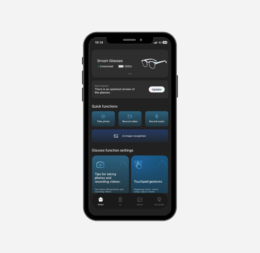 Use the Smart Glasses AI app to manage your glasses, customize settings, share photos and interact with your Chat-GPT AI assistant. The Smart Glasses AI app is required to support your glasses experience.